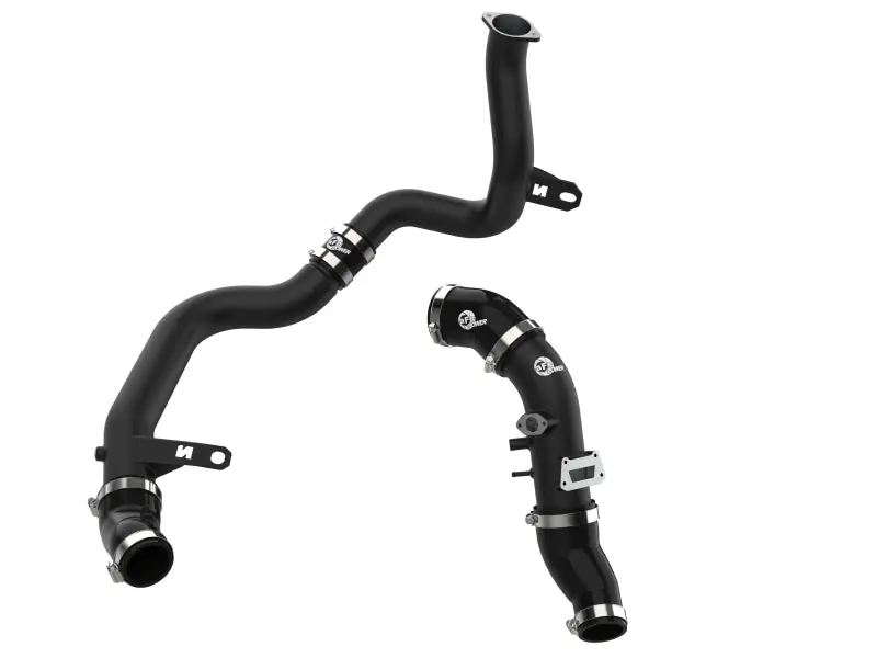 Smooth transitions in the mandrel-bent aluminum pipes decrease turbulence and minimize pressure loss, increasing horsepower and torque. This charge pipe kit provides a smooth transition between the turbo and the engine for lower operating temperatures and increased power. This kit includes high-quality, stainless-steel, SmartSeal clamps and heavy-duty, 5-ply, polyester reinforced silicone couplings for superior strength and durability. Finished in wrinkle black powder coating with a unique laser-etched aFe POWER logo for a custom look.