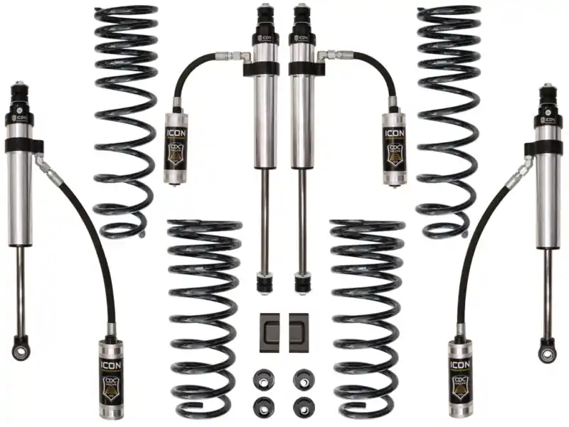 - After an in-depth R&D process, ICON engineers have developed a 3†suspension system for the 80 Series that is aimed to improve on-road handling characteristics while also maximizing the Land Cruiser’s off-road potential. This Stage 3 system includes ICON-designed dual rate coil springs, caster correction bushings, sway bar relocation components, all bracketry and hardware required for install, and ICON Vehicle Dynamics 2.5 Series remote reservoir shocks that feature a vehicle specific valving for optimized ride quality and balanced damping front to rear. The 2.5″ remote reservoir shocks front and rear ensure optimum performance by increasing the duration of consistent damping regardless of situation, keeping the shocks at a cooler operating temperature during extended off-road use. The Stage 3 system outfits the 80 Series Land Cruiser with ICON 2.5 Series shocks that feature CDCV, or Compression Damping Control Valve. This technology allows end-users to quickly adjust the ride quality of their shocks with the simple turn of a knob – no tools required! With ten high-resolution settings to choose from, the ICON CDC Valve will allow for the perfect ride quality across any terrain. This ICON Stage 3 System is the perfect suspension system for drivers seeking a quality on-road ride with outstanding off-road performance under extreme use, and the ability to fine tune the vehicle’s performance for any conditions encountered.