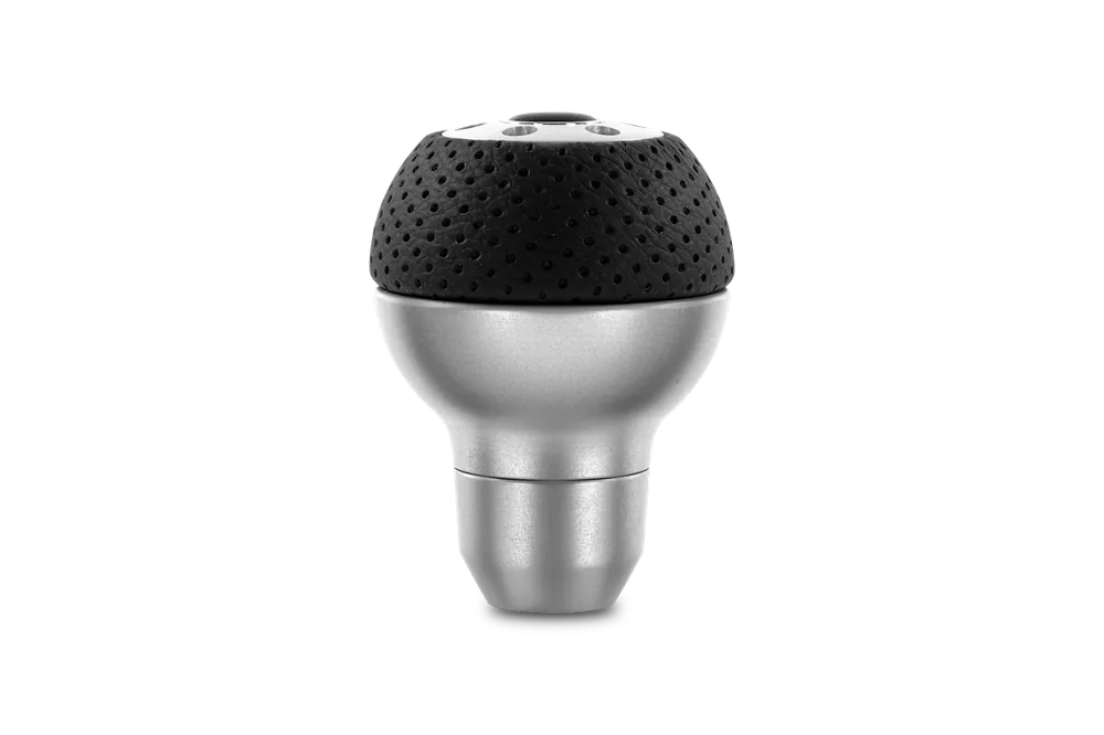 Black airleather with machined aluminum accents. Black Momo logo cap and aluminum collar.