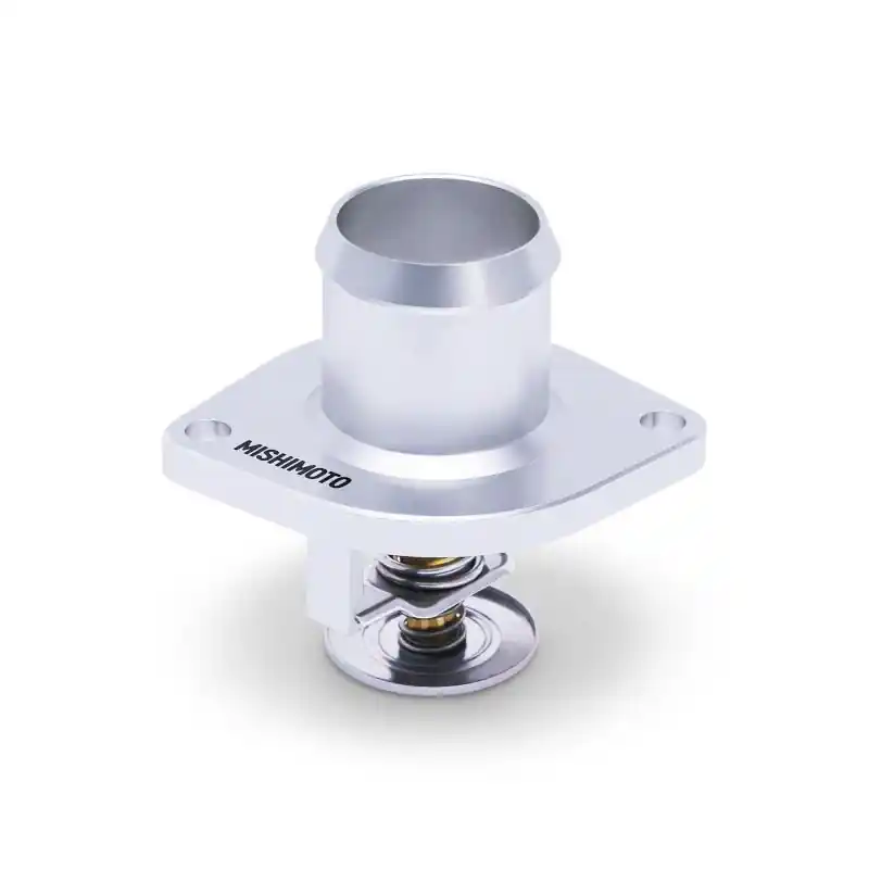 - Lower activation temperature allows coolant to flow through the engine earlier, maintaining lower temperatures (Mishimoto thermostat activates at 185°F vs. factory 192°F)