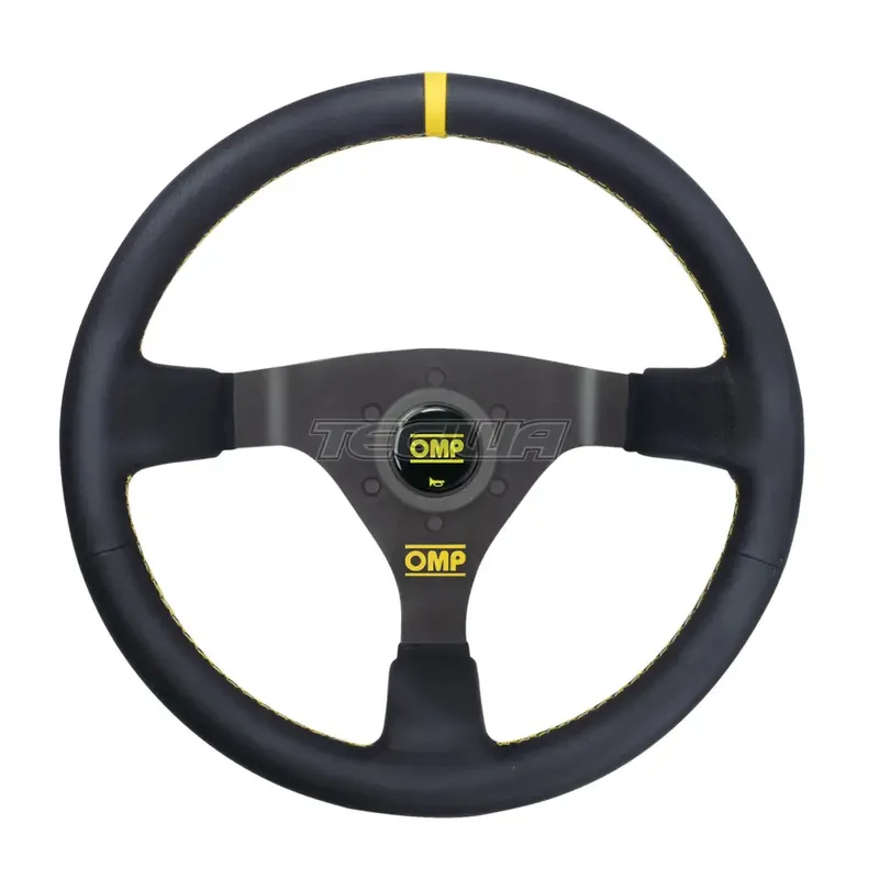 OMP WRC Black Smooth Steering WheelDished steering wheel with 3 black anodized spokes. In smooth leather. Yellow stitching. Supplied with horn button. Depth 70 mm.Colour: Black (071) Handle: round, 30 mm Diameter: 350 mm Depth: mid-dept dished