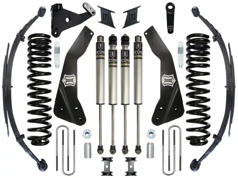 - ICON Vehicle Dynamics is an industry leader when it comes to Ford Super Duty performance. Our engineers have spent countless hours under these trucks and behind the wheel developing some of the most refined suspension systems available. Increasing wheel travel and ride comfort is standard operating procedure at ICON, but our engineers aimed high to produce a suspension solution that also maintained the Super Dutys towing capacity. ICONs 7 Suspension System for the 2011-2016 Super Duty yields enough lift to clear 37 tires while providing excellent ride characteristics across a wide variety of terrain on and off-road. Each component of this suspension system has been specifically engineered to work in union with other ICON parts to extract maximum performance out of the vehicle. Our Stage 2 System is comprised of 7 lift dual rate coil springs, fabricated radius arm drop mounts with brushed stainless badges, track bar drop bracket, bump stop extensions, sway bar links, a forged pitman arm, brake line brackets, rear 5″ lift progressive rate leaf springs w/ U-bolts, and 2.0 Aluminum Series smooth body front & rear shocks.