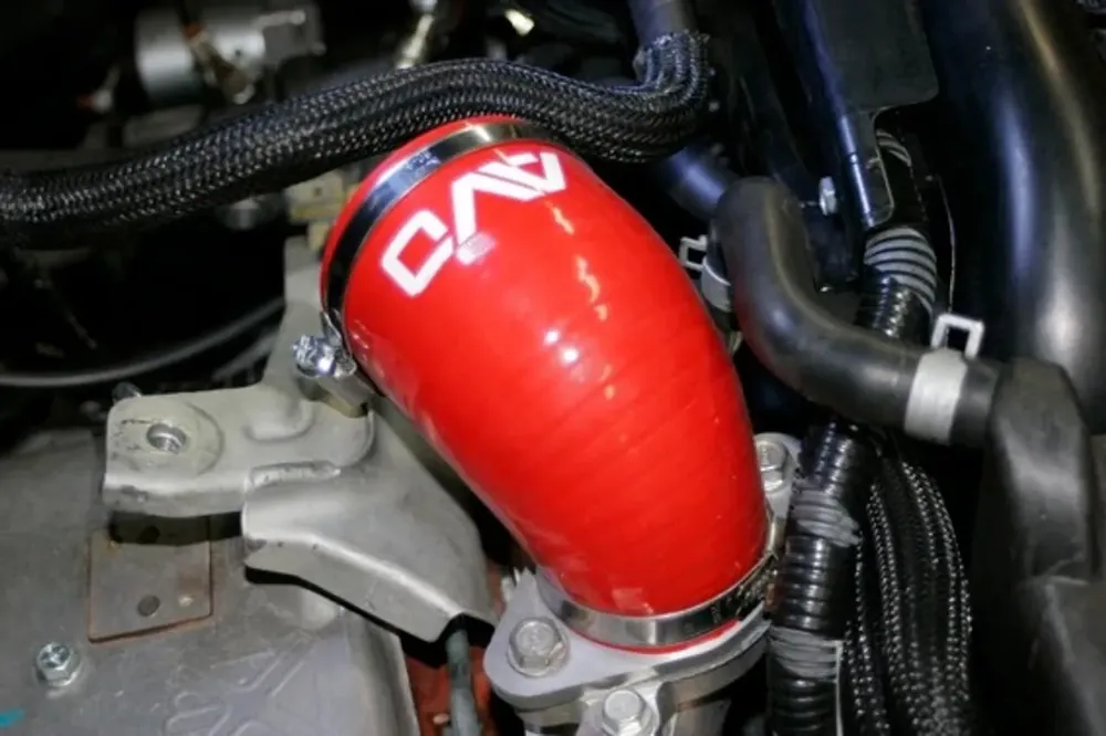 AVOTurboworld designed its Silicone Turbo to Intercooler hose with 5-ply silicone reinforcing for use with the stock or AVO top mount intercoolers.The major reason for this product was to overcome the factory plastic version that cracks and leaks over time.It increases flow and is more durable than the stock hose, and also makes it easier to install as you can swivel the hose on the aluminium adaptor once it is bolted down.